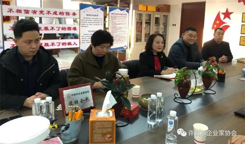 2021年12月30日下午,許昌市委統(tǒng)戰(zhàn)部副部長、工商聯(lián)黨組書記寇玉平、工商聯(lián)副主席張濤輕車簡從、深入許昌市企業(yè)家協(xié)會(huì)調(diào)研指導(dǎo)工作,并與企業(yè)家協(xié)會(huì)負(fù)責(zé)人進(jìn)行了座談交流。秘書長黃玉霞、本月值班會(huì)長范文彥、三月份值班會(huì)長張水杰、副會(huì)長董國良、會(huì)員李海鵬等參加座談。座談會(huì)上,黃玉霞秘書長匯報(bào)了今年重點(diǎn)工作安排和會(huì)員企業(yè)發(fā)展情況。